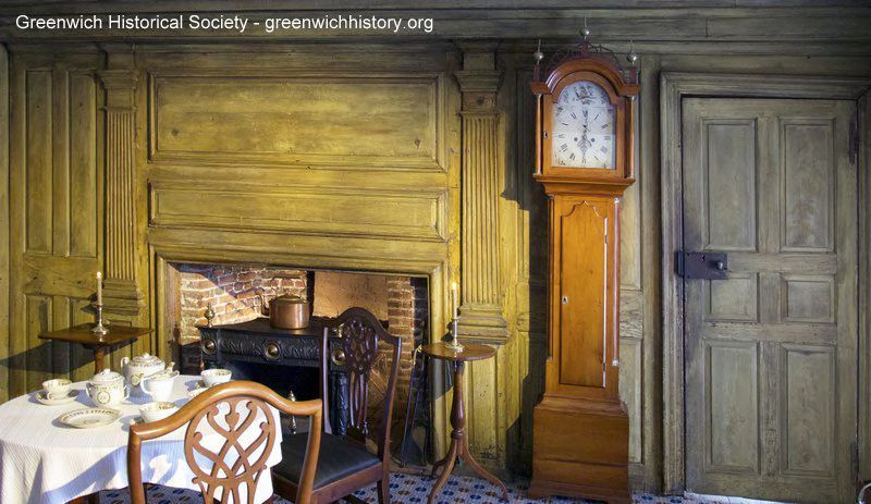 Partial view of the parlor (room 103) in the Bush-Holley House. Panneling on the wall, installed between 1755 and 1771, was originally painted blue and later painted with a faux wood grain. A tall clock stands by the door near the fireplace, which has a Franklin wood burning stove inside.Collection