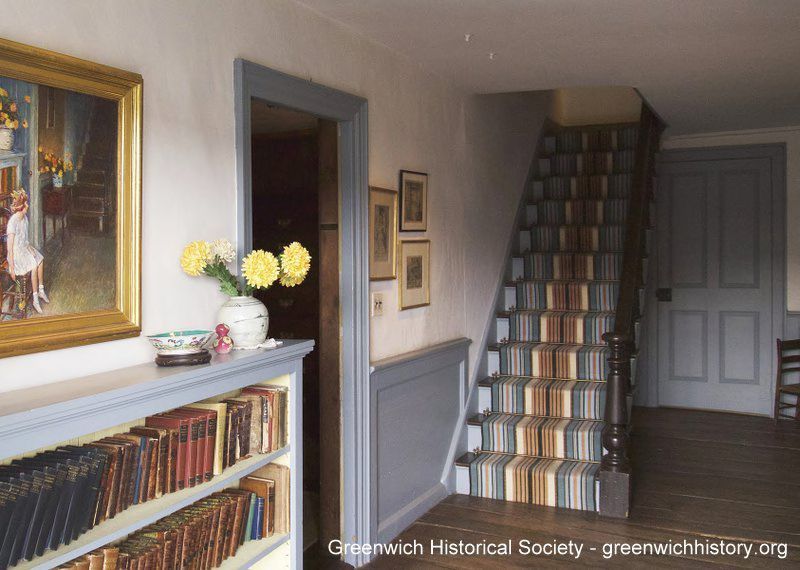 Front hall and stairs (room 102) of the Bush-Holley House. Painting of Clarissa MacRae by Child Hassam hangs on the wall.Collection
