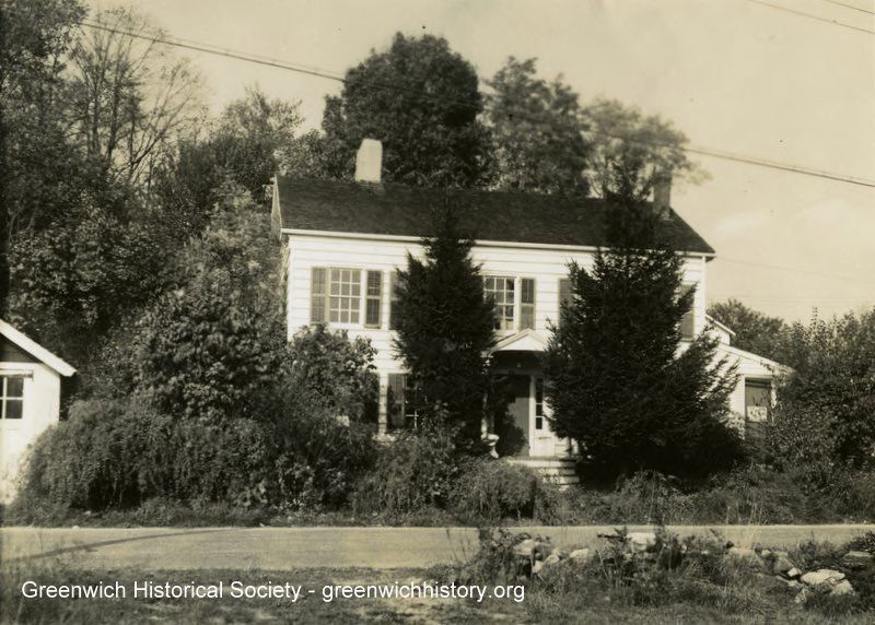 Two story colonial style home with a one story side wing and a detached garage. The house is obscured by overgrown foliage. Telephone lines are visible across the street.Collection