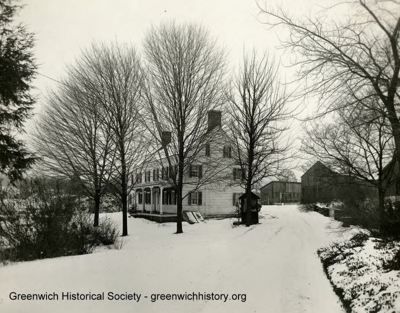 Side view of Colonial style homstead house on Pecksland Road with several barns visible in back of the houseCollection