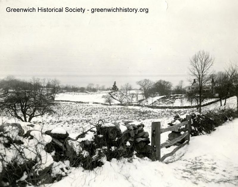 Distant view of Colonial style home on 60 acres of land in the winter. The view is from the fields, with a stone wall and small fense in the foreground and trees, more stone walls and the house in the background.Collection