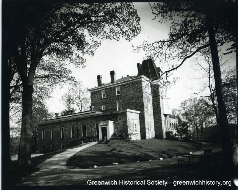 Field stone building on a hill top with a small front entrance, multiple wings, a bay window and a porch. Paved walkways lead to the front and side entrances.Collection