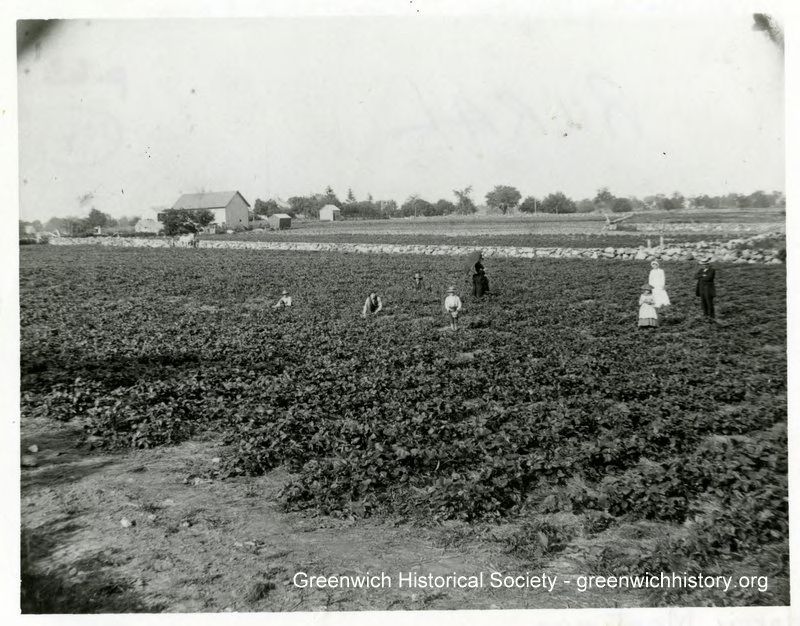 Laborers and others in a strawberry field on Quintard Farm. In addition to the laborers, there is a man in a suit, a women with a parasol, and two children in the field. The fields are separated by stone walls and there is a barn and other buildings in the background.Collection