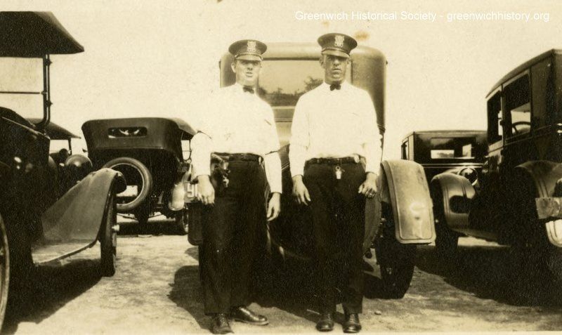 Two police officers wearing white shirts, bow ties and hats with insignias in front posing behind four parked automobiles, presumable police cars.Collection