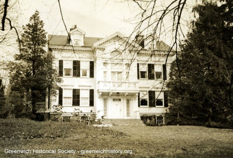 Majestic, three story home at 101 Brookside Drive with shutters on the windows and obscuring evergreen trees removed from the front of the house. The full height, centered gable projecting from the center of the house is adorned with a second story balcony beneath french doors, surrounding rectangular windows, and a half-round fanlight window on top. A decorative arch extends from the second story into the gable's front pediment above the roof. Wide, bracketed eaves trim the pediment and extend along the roof junction. (For earlier photos, see PC000676-PC000678)Collection