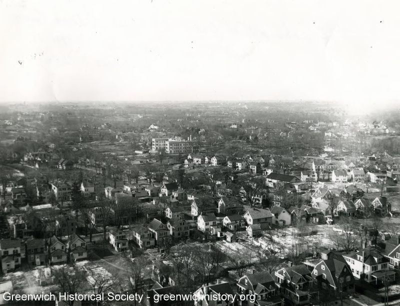 Aerial view of residential central Greenwich in winter, looking northwest from the Second Congregational Church tower, showing modest sized houses and the Greenwich Hospital building in the centerCollection