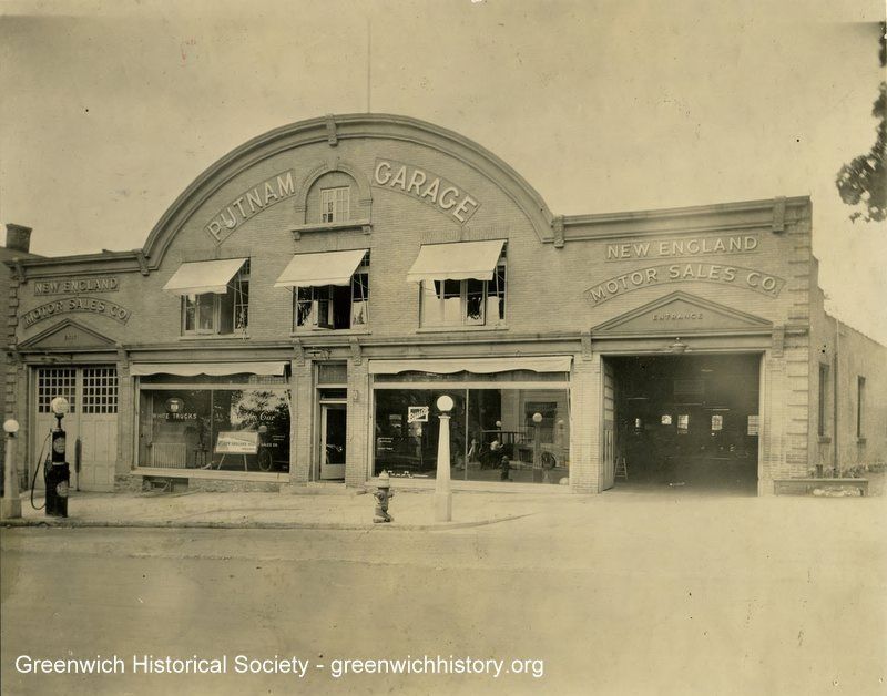 Two story brick facade building with large arch in the middle. Signs for "Putnam Garage" and "New England Motor Sales Co." are attached to the building over the two garage entrances and showroom windows. Awnings are attached to the windows on the first and second stories. A gas pump is outside the building.Collection