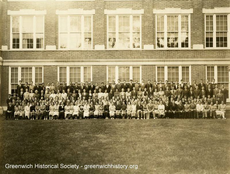 Members of the Greenwich High School graduating class, circa 1936 or 1938, arranged in five rows in front of the school building.Collection