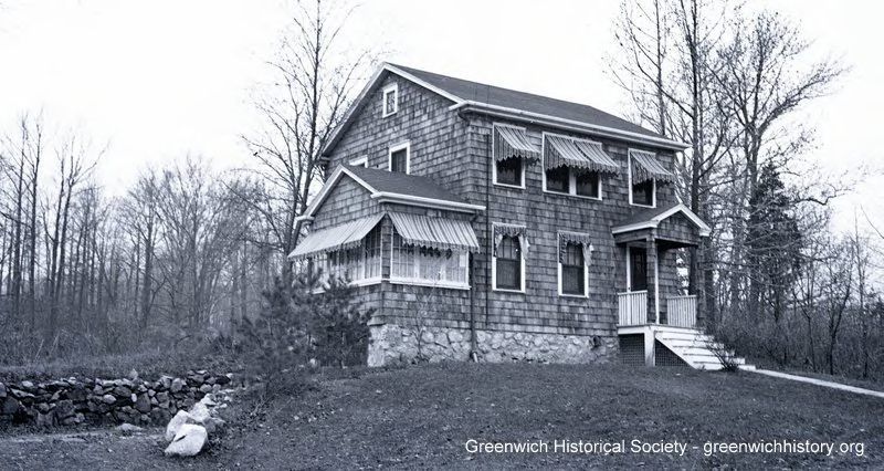 Two story shingled home with one story wing off the left, awnings over the windows, and a pedimented portico at the entrance.Collection
