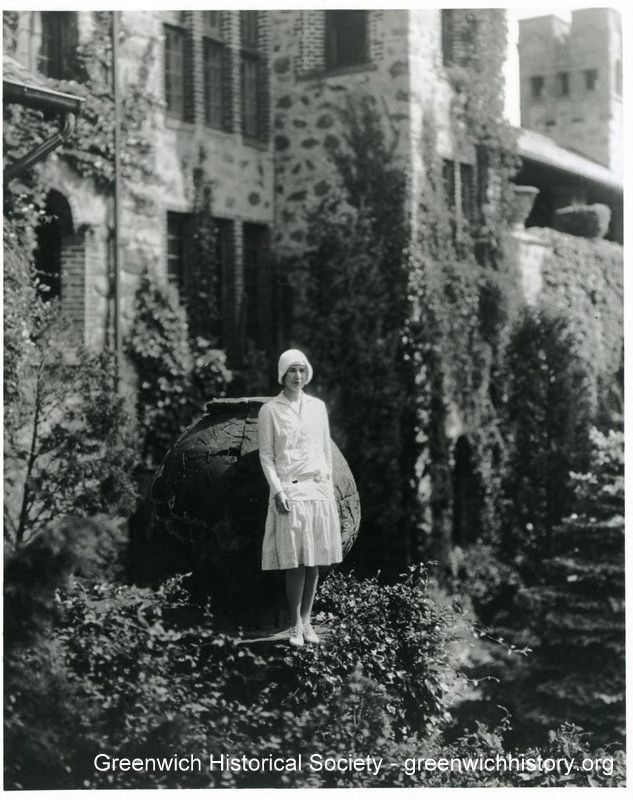 Mrs. J. T. Mitchell standing outside "The Castle" in front of the antique oil jar James Green purchased from Stanford White.Collection