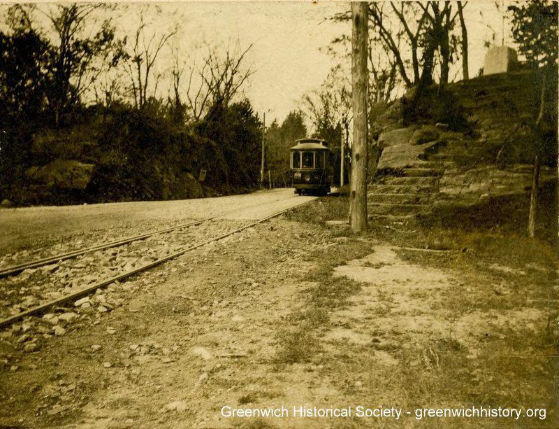 Rear view of trolley car on trolley tracks passing Putnam Hill. Steps on the hill and the Isreal Putnam monument are visible on the right.Collection