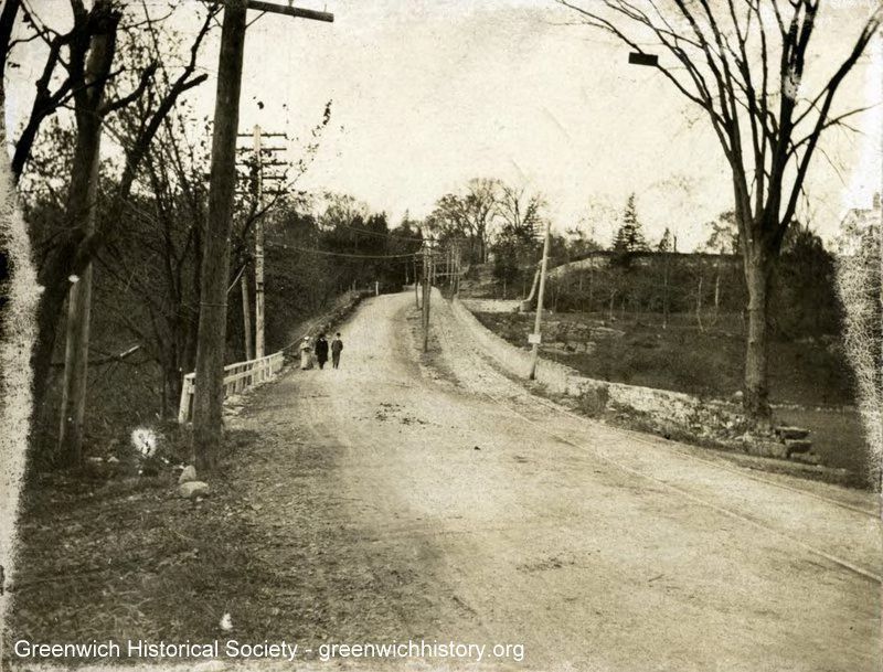 Two men and a woman walking on East Putnam Avenue near Putnam Hill. Trolley tracks are visible on the side of the road. E. H. Baker's house is slightly visible on the far right.Collection