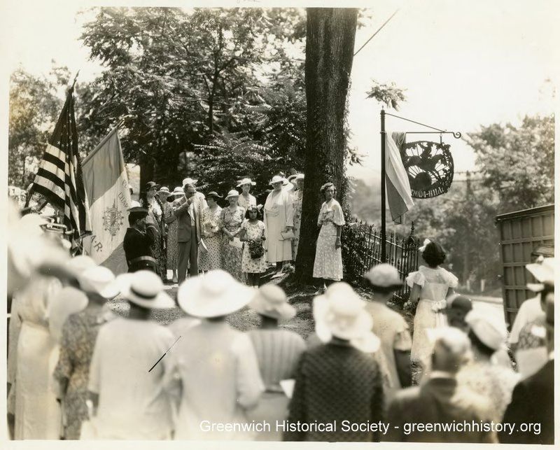 Dedication of Putnam Hill sign during the Connecticut Tercentenary. The sign is designed by George Wharton Edwards and is donated by the Daughters of the American Colonists (Angell Husted Chapter). A group of men, women and girls stand in a circle near the sign.Collection