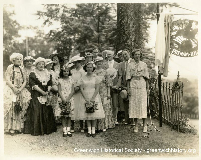 Dedication of Putnam Hill sign during the Connecticut Tercentenary. The sign is designed by George Wharton Edwards and is donated by the Daughters of the American Colonists (Angell Husted Chapter). A group of men, women and girls stand near the sign. Some of the women are in colonial costume. The man holding his hat on his chest is George Edwards.Collection