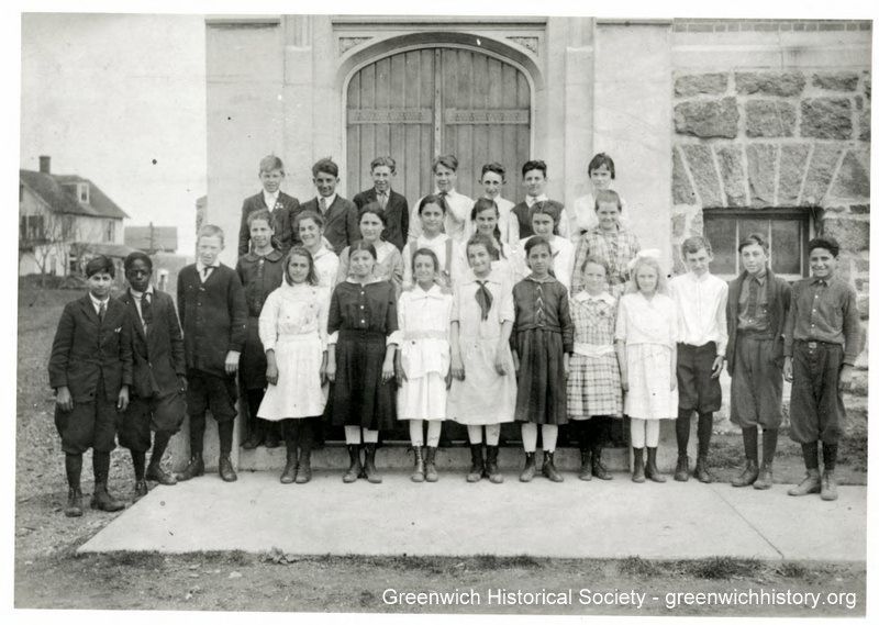 Twenty-seven boys and girls and their teacher standing in front of a double door corner entrance to Hamilton Avenue School. The people are identified as follows (left to right): First Row: no. 1, Peter Fortugno; no. 4, Theresa Moore; no. 5, Philomena Morano; no. 6. Julia Mazza; no. 7, Margaret Roina; no. 8 Katherine Covella; no. 12, Peter LaMorte; no. 13, Edward Lori. Second Row: no. 1, Beatrice Washburn; no.2, Rose Powell; no. 3, Emily Spezzano; no. 4, Margaret Donatelli. Last Row: no. 7, Miss Lillian Kelleher, teacher.Collection