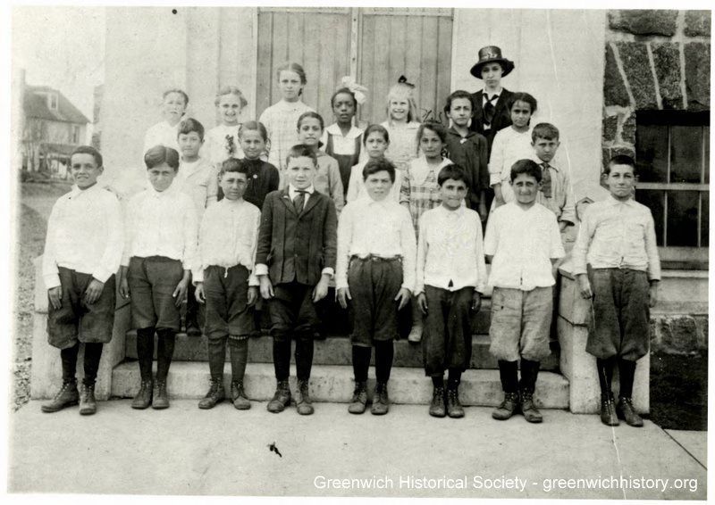 Twenty-one boys and girls and their teacher standing in front of a double door corner entrance to Hamilton Avenue School.Collection