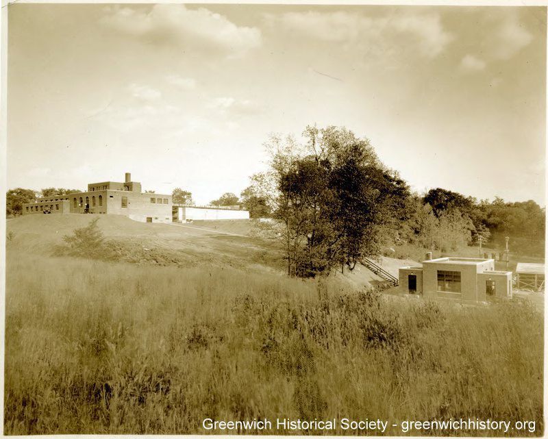 Two industrial buildings located on a sloping field with tall grass. Stairs and a sidewalk extend up the slope, connecting the buildings. Trees are between the buildings and in the background.Collection