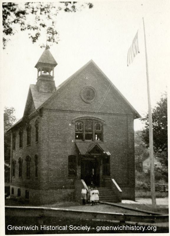 Children standing at the bottom of the steps to the Glenville School, circa 1917. The building is a two story brick structure with a bell tower.Collection