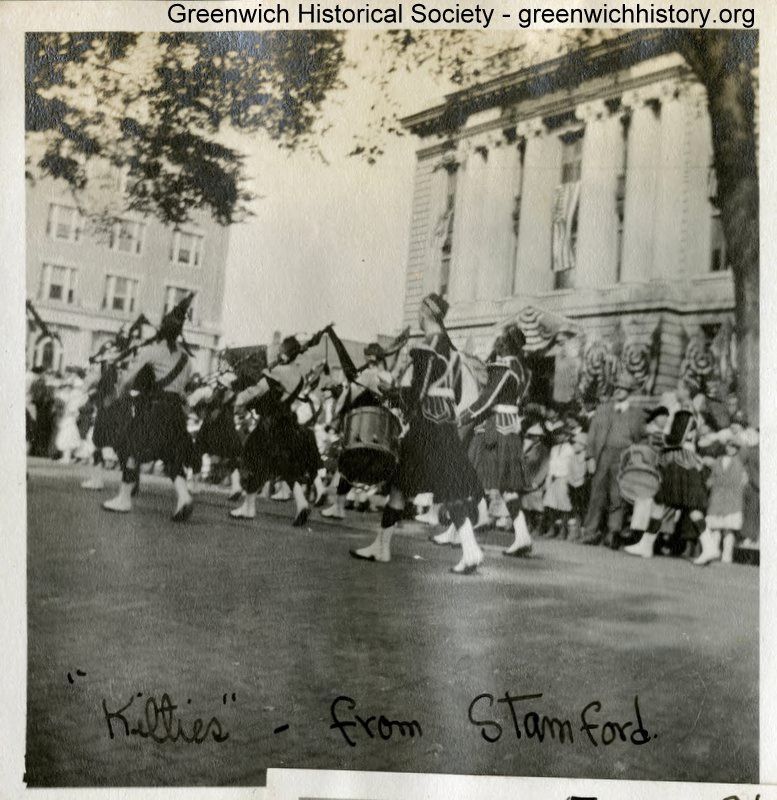 Kilties from Stamford in Fourth Annual Liberty Loan parade up Greenwich Avenue. 289 Greenwich Avenue is at left; Town Hall (299 Greenwich Avenue) is at right.Collection