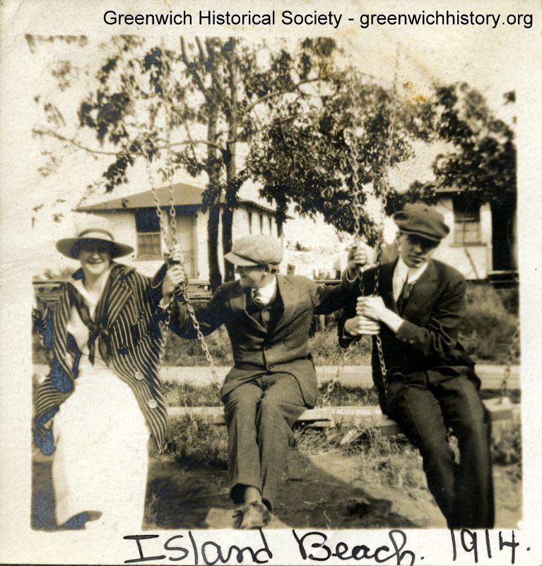 A woman and two men on swings at Island Beach. Cottages are in the background.