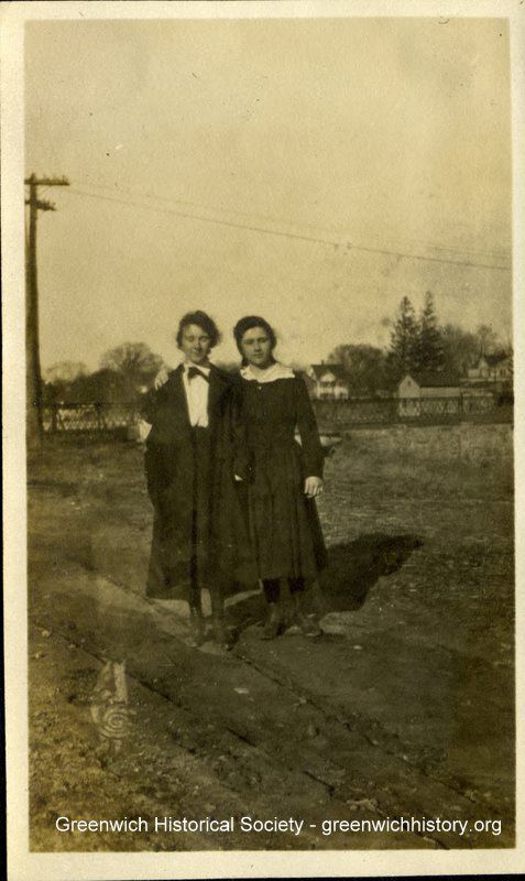 Mabel and Katherine Burke, daughters of Tobias Burke, standing in an unpaved area with a bridge, water and houses in the backgroundCollection