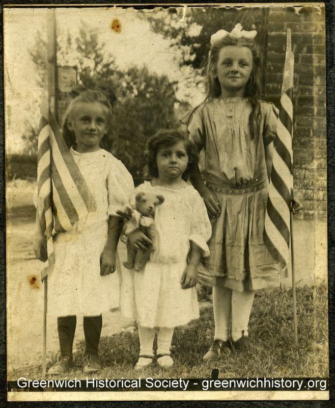 Katherine, Mabel and Helen Burke ( left to right) dressed in fancy dresses and hair bows, holding two American flags. Mabel is holding a teddy bear. The girls are daughters of Tobias Burke, owner of Toby's Tavern.Collection