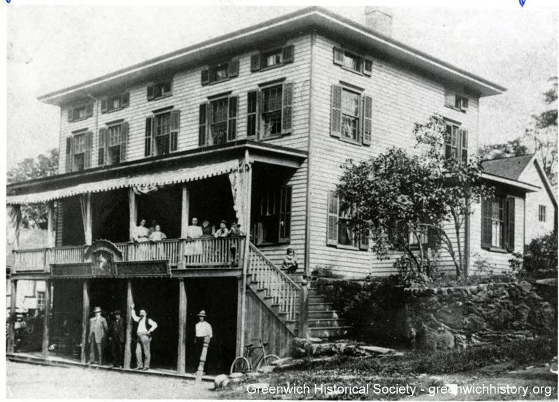 Three story clapboard building with raised, full-width porch outside the second story. Men are standing outside the bottom level and women and children are on the porch.Collection