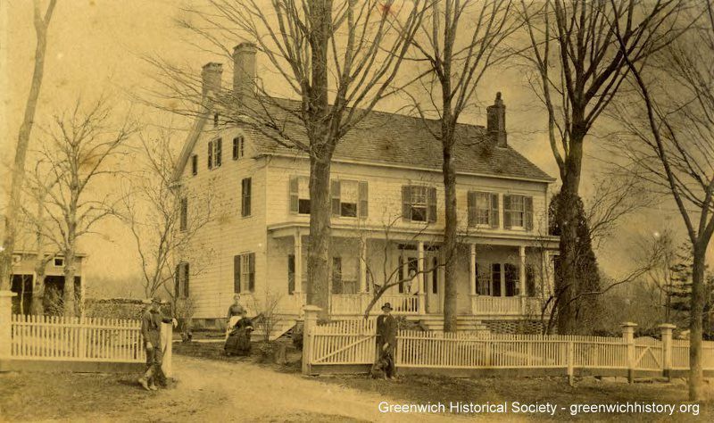 Two-story, five-ranked, clapboard home with four chimneys, shutters on the windows, and a one-story fulll-width porch. A white picket fence is at the front of the house and a detached barn is in back. Three women, two men and a dog are outside the house.Collection