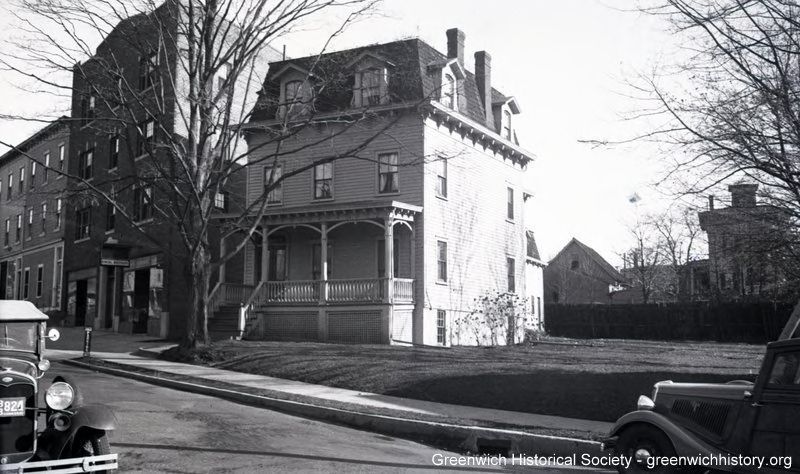 Home of John Lockhart, built in 1867 and added to Greenwich Landmarks Registry in 2013. The clapboard, three story house has a mansard roof with pedimented dormers, two chimneys and a full-width, one-story porch. Attached buildings are on one side of the house and undeveloped land is on the other. Automobiles are partially visible on the street in front of the house.Collection