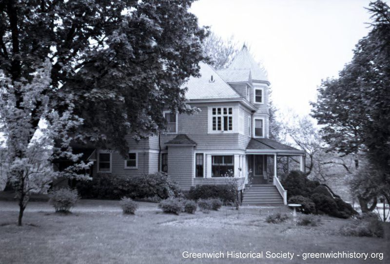 Porch entrance view of shingle style, multi-story home, circa 1900, with one-story wrap porch around bay window tower and side of house.Collection