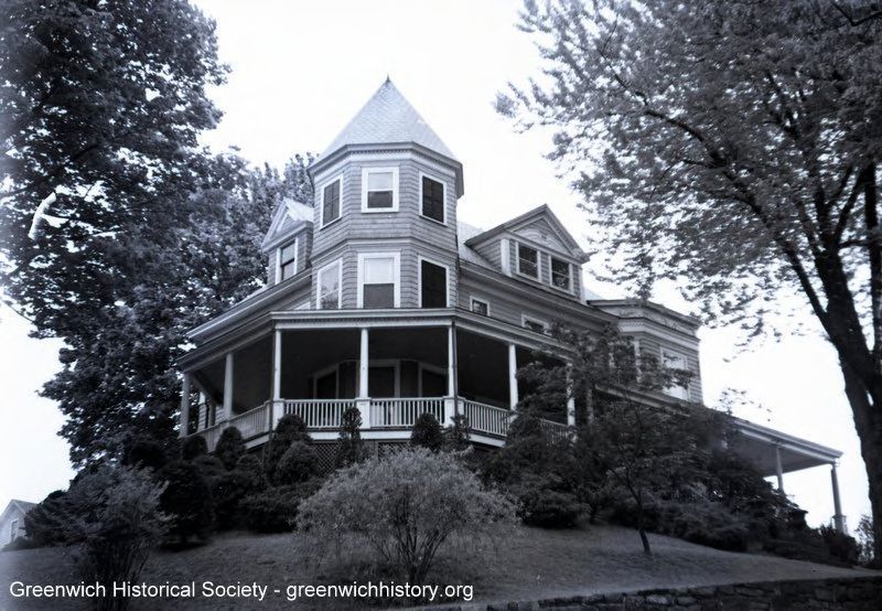 Porch view of shingle style, multi-story home, circa 1900, with one-story wrap porch around bay window tower and side of house.Collection