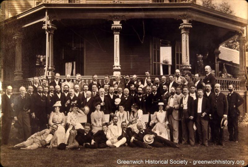 A large group of men and some women gathered in front of the porch of E. C. Benedict's first home in Greenwich