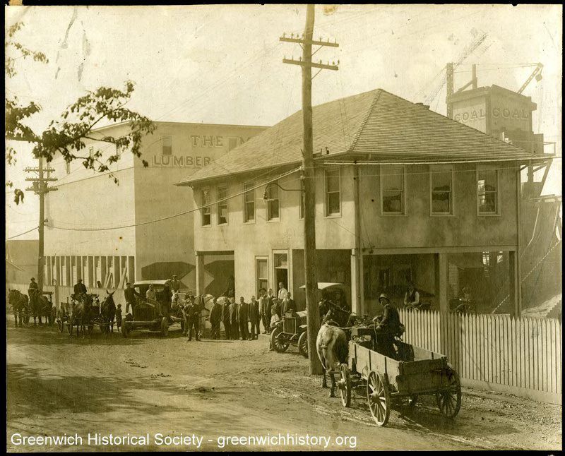 Men, cars, and horses & carriages lined up in front of two Maher Brothers buildings on unpaved Steamboat Road. Coal tower is in the background on the right.Collection