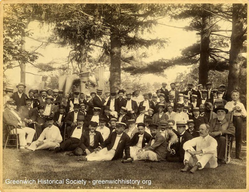 Numerous men wearing jackets and hats gathered on a lawn under the trees.