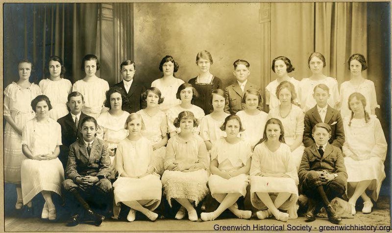 Members of the New Lebanon School graduating class of 1923. The boys are wearing suits and the girls are wearing white dresses. The students names are listed on the back of the photo as: Top row, left to right: Helen Wellner, Julia Klimas, Mary Bartlik, Walter Weising, Alice Behunger, Miss Honzman, teacher, Cornelius Sulllivan, Helen Danko, Mary Kristaff, Gladys Sniffen. Middle row, left to right: Maybell Africa, Paul Kolok, Bessie Smith, Lillian Wallner, Prieda Kirschbauser, Grace Senft, Julia Roscoe, Marie Holst, Joseph Tattar, Katherine Rapp. Front row, left to right: Arthur Goodhue, Lillian Suojanen, Thelma Merritt, Blanche Cornsich, Julia Geyno, Johy Ya.Collection