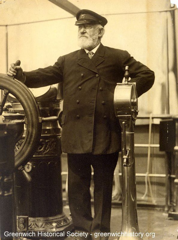 Commodore E. C. Benedict dressed in coat and cap standing with his hand on the wheel of the OneidaCollection