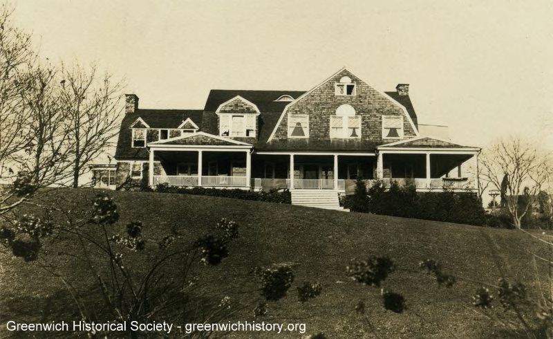 Shingle style home with wrap around porch viewed from the front yard in spring.