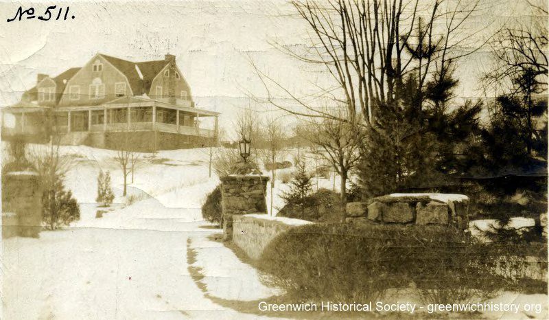 Shingle style home with wrap around porch viewed from the driveway in winter. Driveway entrance is flanked by a stone wall and pillars with lanterns on top.Collection
