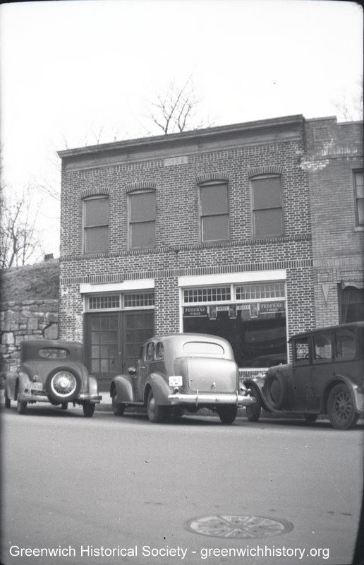 Two story brick building with one large window and two glass-paned doors at street level. Three cars are parked on the street in front of the building.Collection