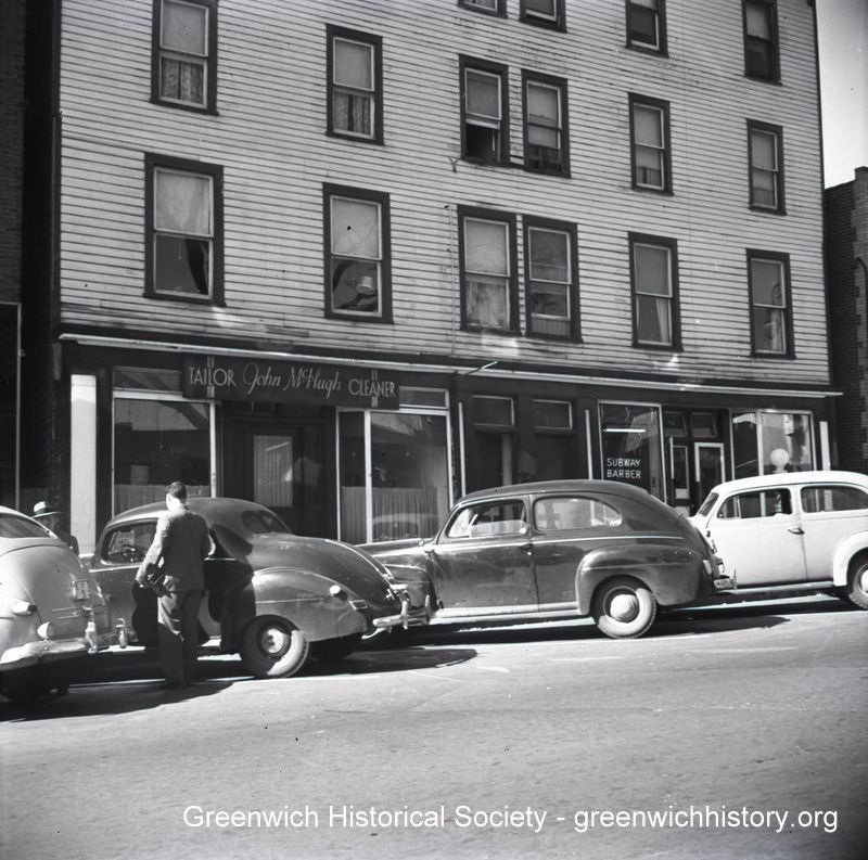 Multi-story clapboard building with store front windows on the ground floor advertising John McHugh Tailor Cleaner and Subway Barber. Four cars are parked on the street in front of the building.Collection
