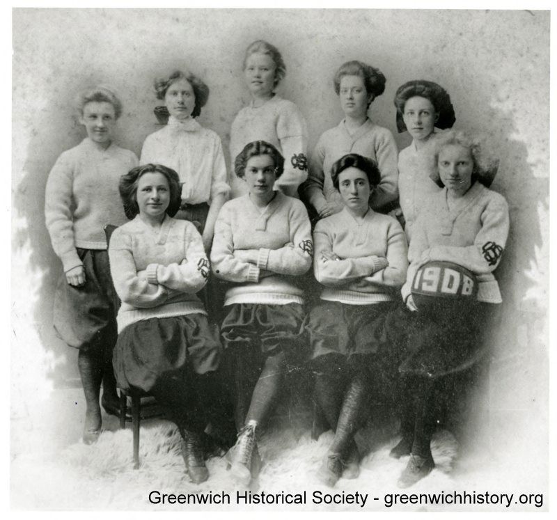 Members of the 1908 Greenwich High School Girls Basketball Team, dressed in sweaters, pantaloons and stockings. The girls have long hair, secured in the back with large bows.Collection