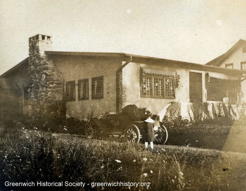 One story stucco house with stone chimney on the outside and retracted awnings over larger windows. A car and rear view of a child are visible in the driveway.Collection