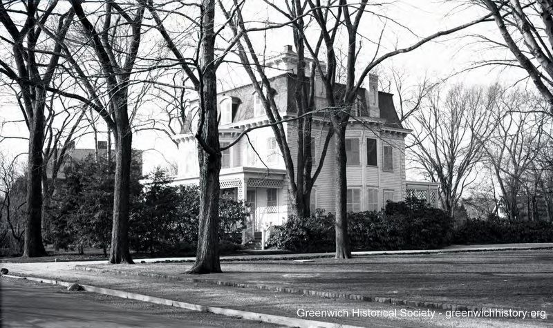 Clapboard sided house with mansard roof and dormers and surrounding bracketed eves; front and rear porch, and bay windows in front and on side. Tall trees line the road in front of the house.Collection