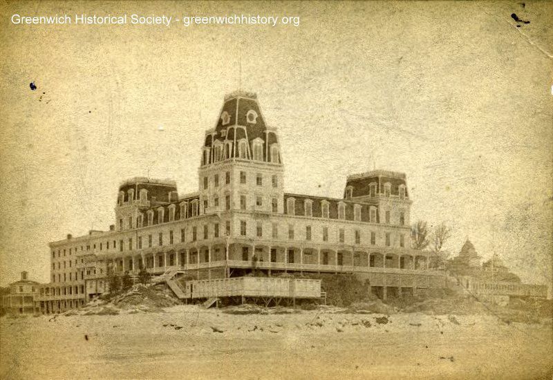Corner View of Indian Harbor Hotel from Indian Harbor. Outbuildings visible on the right and left.