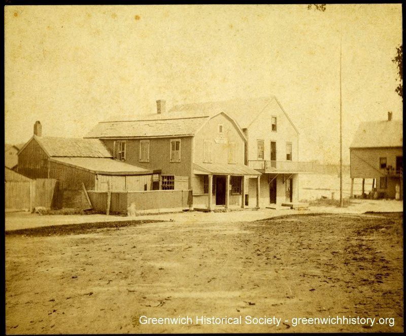 A rare view of the lower landing at Cos Cob, ca. 1880-90. Four buildings face a dirt road with their backs abutting the water.Collection