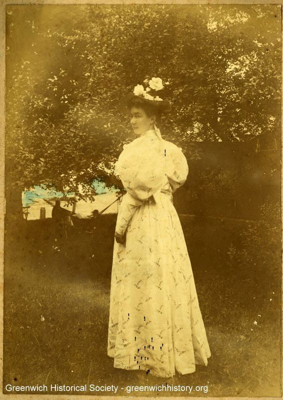 Rear view portrait of Emma Holley MacRae standing outside wearing a light colored dress with long mutton sleeves and a hat with flowers. The storehouse is visible in the background along with a small view of the waterfront.Collection