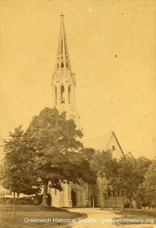 Front entrance of the church and bell tower from the front walkway. The middle portion of the edifice is obscured by tree foliage.Collection