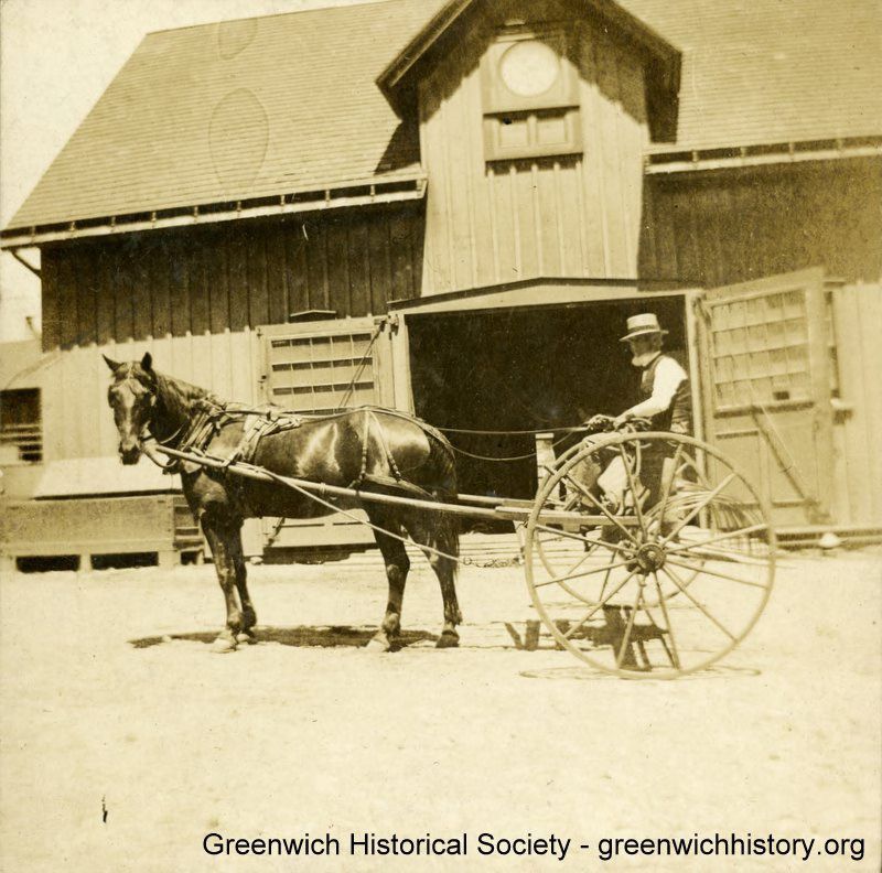 Solomon S. Mead seated in a cart pulled by his horse "Mystery" standing in front of a barn or stable with open doors and a raised center loftCollection