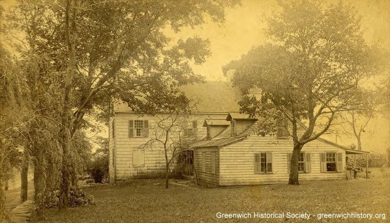 Side view of a one story clapboard house with shutters attached to adjacent two story clapboard structure. Trees shade parts of the buildings.Collection