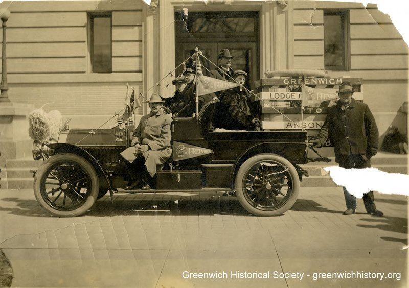 Roofless, truck-type automobile decorated with Greenwich pennant flags and giant pompoms parked in from of building which probably is the former Town Hall (299 Greenwich Avenue). Five men, including one in a fur coat, are seated in the car and one is standing at the rear.Collection